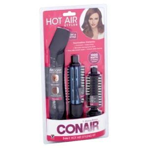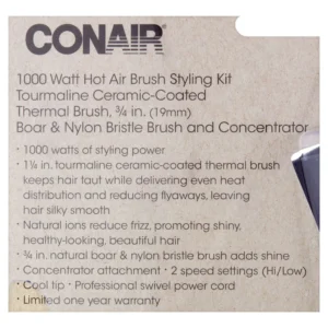 Explore endless looks while minimizing damage and maximizing shine with the Conair 3-in-1 Double Ceramic Hot Air Brush. Designed with 2x the ceramic content to ensure even heat for fast styling and long-lasting results (as compared to standard Conair ceramic technology), this ultra-versatile styling brush comes with 3 interchangeable attachments to keep your look on trend. Use the 1.25-inch thermal brush attachment to create a wide variety of curly or straight styles. Crave quick curls with a polished finish and added shine? Attach the 0.75-inch nylon and boar bristle brush. The brushes’ double ceramic barrels smooth down flyaways with an easy glide as even heat leaves your hair silky smooth with healthy-looking shine and manageability. Each brush is topped with a cool tip that makes swapping them out easy. For silky-straight looks and precision styling, snap on the concentrator attachment. Choose from 2 heat settings for customized styling to match your hair type. Set to high heat for thick hair or low heat for fine hair.