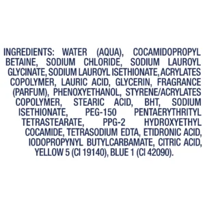 Water (Aqua), Sodium Chloride, Cocamidopropyl Betaine, Sodium Lauroyl Glycinate, Sodium Lauroyl Isethionate, Acrylates Copolymer, Lauric Acid, Glycerin, Fragrance (Parfum), Stearic Acid, Palmitic Acid, Cucumis Sativus (Cucumber) Juice, Camellia Sinensis Leaf Extract, Phenoxyethanol, Glycol Distearate, BHT, Tetrasodium EDTA, PEG-150 Pentaerythrityl Tetrastearate, PPG-2 Hydroxyethyl Cocamide, Iodopropynyl Butylcarbamate, Citric Acid, Linalool, Limonene, Hexyl Cinnamal, Alpha-Isomethyl Ionone, Yellow 5 (CI 19140), Blue 1 (CI 42090).