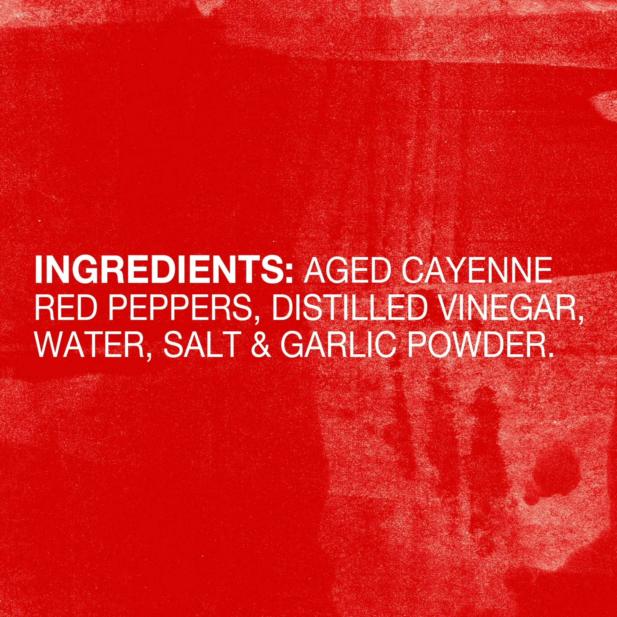 Aged Cayenne Red Peppers, Distilled Vinegar, Water, Salt and Garlic Powder.