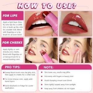 - How To Use – First open the bottle cap of the blush stick, twist the bottom to unscrew the paste, apply it gently on the cheeks and lips, and then use your fingertips or makeup brush to blend evenly to make the makeup effect more perfect. You can apply or layer other blushes multiple times to adjust the depth of color.