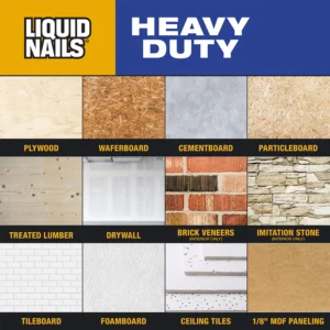 LIQUID NAILS® Heavy Duty 10 oz Construction Adhesive (LN-903/LNP-903) is a multipurpose, low-solvent, high-strength construction adhesive specially formulated to provide the professional and do-it-yourselfer excellent adhesion and extended working time. Bonds To: Wood, Treated Wood, Plywood, OSB, Waferboard, Particleboard, Drywall, Concrete, Cementboard, Brick Veneers, Tileboard, and Exterior Foamboard.