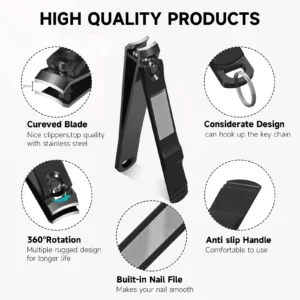 Nail Clipper Set, in a sleek black color, is a unisex grooming essential. This set includes both fingernail and toenail clippers, each designed for specific requirements. The fingernail clippers feature curved edges for precise trimming, while the toenail clippers have sharp edges to handle thick toenails. The clippers are made of 430 stainless steel, offering excellent corrosion resistance, hardness, and sharpness. The contoured handle ensures easy control and a comfortable grip, providing a stress-free use. The set comes in a luxurious tin case, making it easy to carry and suitable for all types of fingernail & toenail clippers. This high-quality, durable FACEMADE Nail Clipper Set is perfect for everyday use and makes an excellent gift choice.