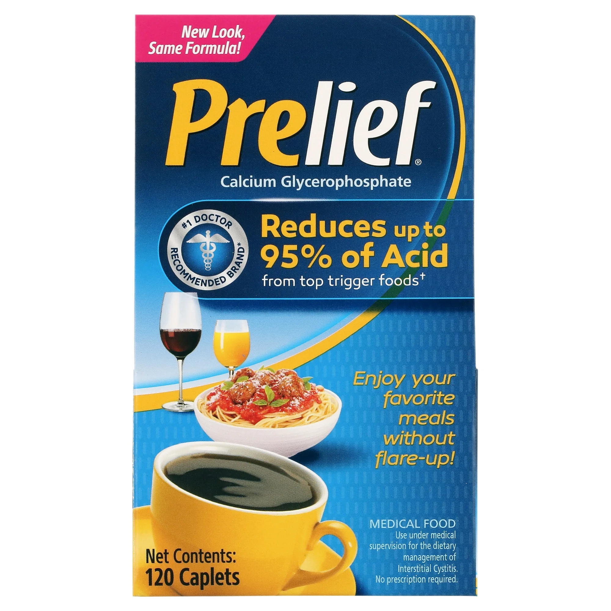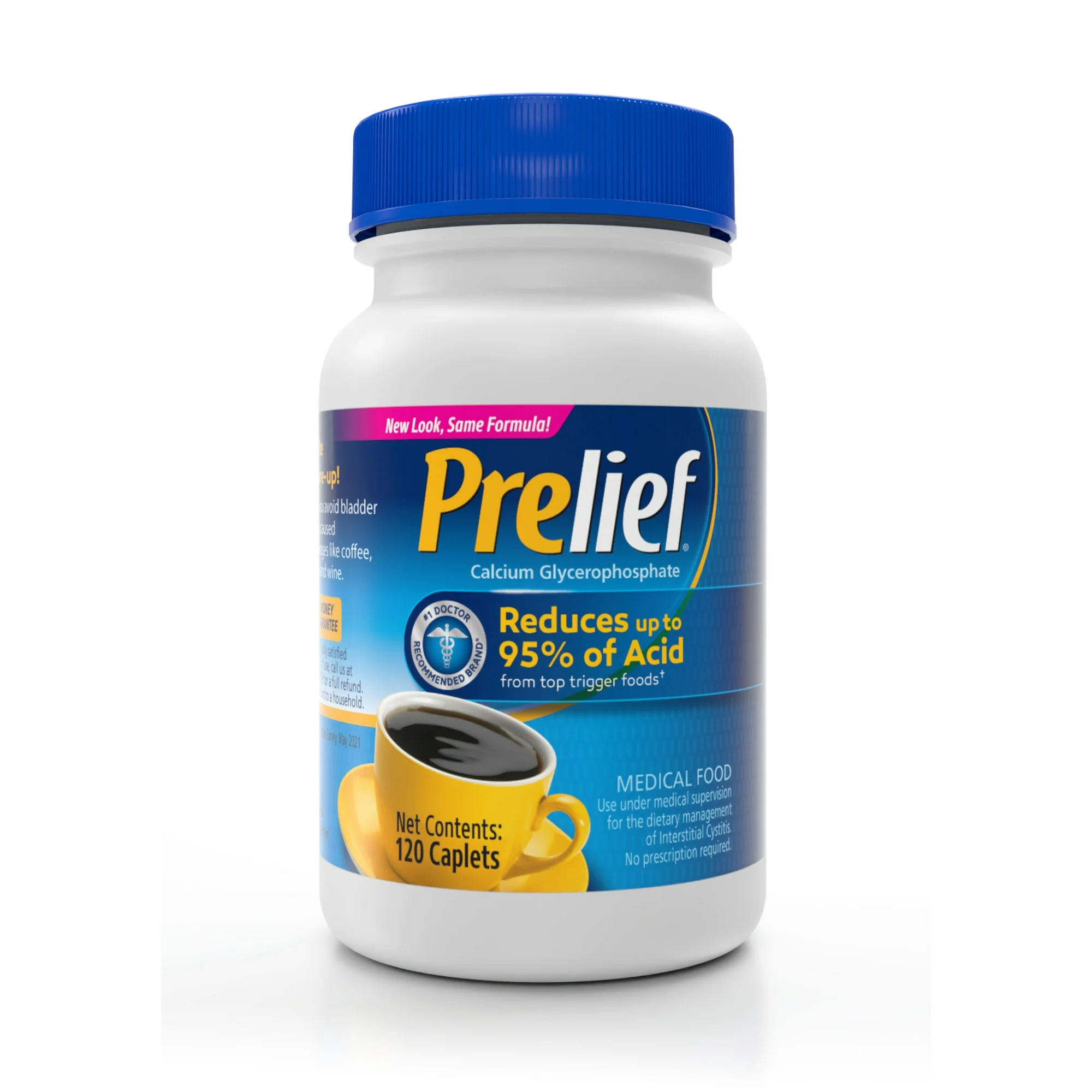 - Drug Free: A good source of calcium, Prelief can be taken as often as you think you will need it; Taking 2 to 3 Prelief caplets with your food or drink can reduce the acid and minimize discomfort