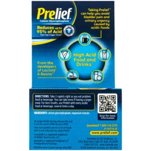 Get relief from your symptoms with this Prelief Dietary Supplement 120 Caplets. If acidic foods bother your bladder, the acid in those foods may be giving you all that trouble. Trigger foods include coffee, fruits and juices, tomato sauce, wine and many others whose acidity is often not immediately obvious until the effects are felt. This Prelief supplement is the only product that takes out food acid as you eat and stops the foods from causing painful symptoms. It treats the symptoms of occasional heartburn and acid indigestion so you can enjoy your favorite foods and drinks again. It’s free of gluten and yeast, as well as drug-free. This Prelief Dietary Supplement 120 Caplets has no side effects, making it very safe for use.