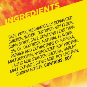 Beef, Pork, Mechanically Separated Chicken, Water, Textured Soy Flour, Corn Syrup, Salt, Contains less than 2% of: Dextrose, Natural Flavors, Paprika and Extractives of Paprika, Maltodextrin, Hydrolyzed Soy Protein, Lactic Acid Starter Culture, Barley Malt Extract, Citric Acid, Soy Lecithin, Sodium Nitrite. CONTAINS: SOY.