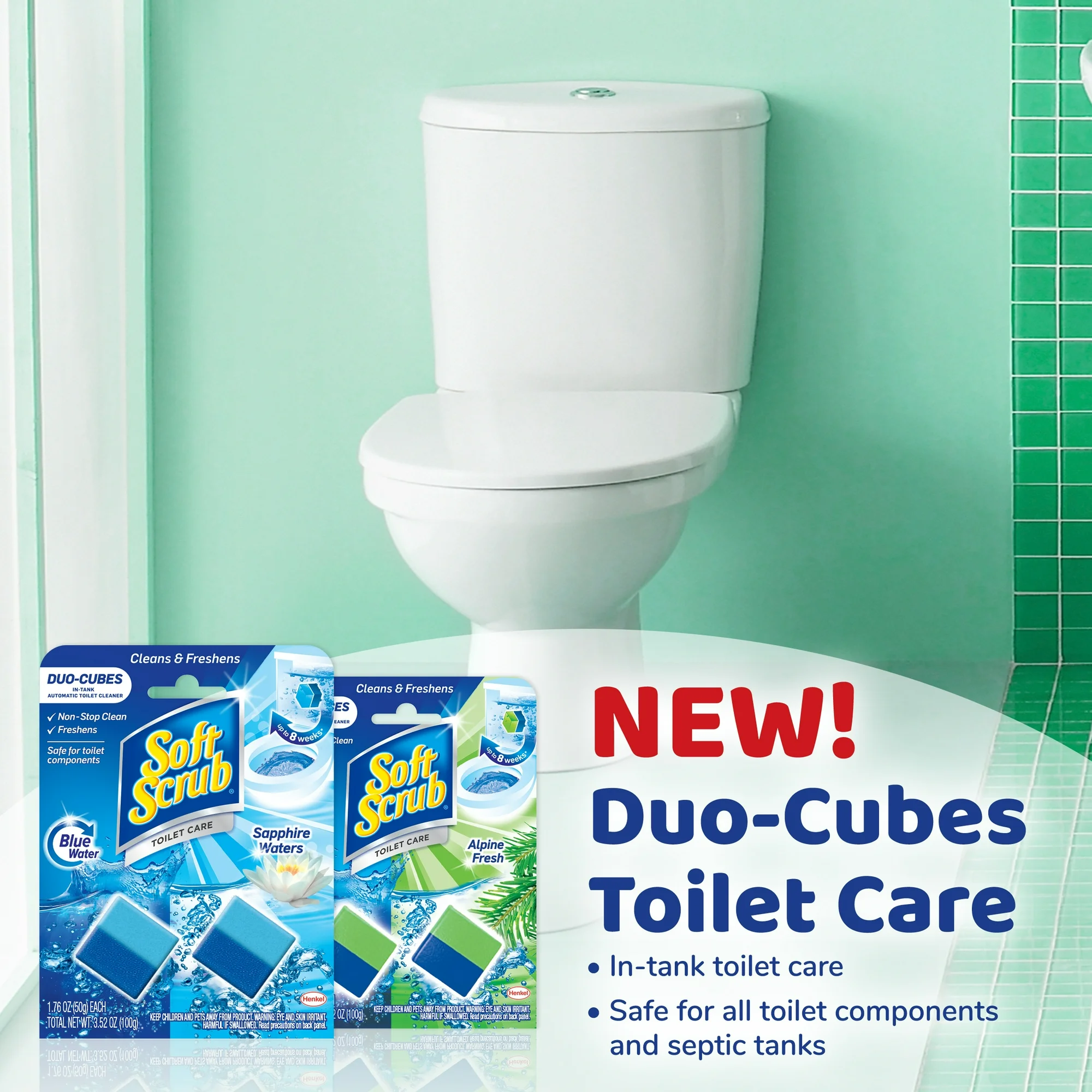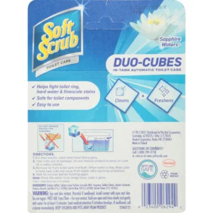 Soft Scrub Duo-Cubes in-tank automatic toilet cleaner helps fight toilet ring, hard water, and limescale stains. Soft Scrub Duo-Cubes are easy to use and safe for toilet components. Just drop a Soft Scrub Duo-Cube in the tank and enjoy cleaning and freshening benefits for up to four weeks! This package contains 2 Duo-Cubes in Soft Scrub’s Sapphire Waters scent for a total of 8 weeks of cleaning. Directions: 1. For best results, clean toilet bowl thoroughly. 2. Take cube out of package. Do not remove protective wrap on cube (it is water soluble). 3. Remove lid from toilet tank and flush. When water is low, drop cube in tank near side wall away from water valve opening on bottom. 4. Wait 10 minutes before flushing again. Note: Once the water is no longer blue, cube is gone. *Each cube lasts up to 4 weeks.